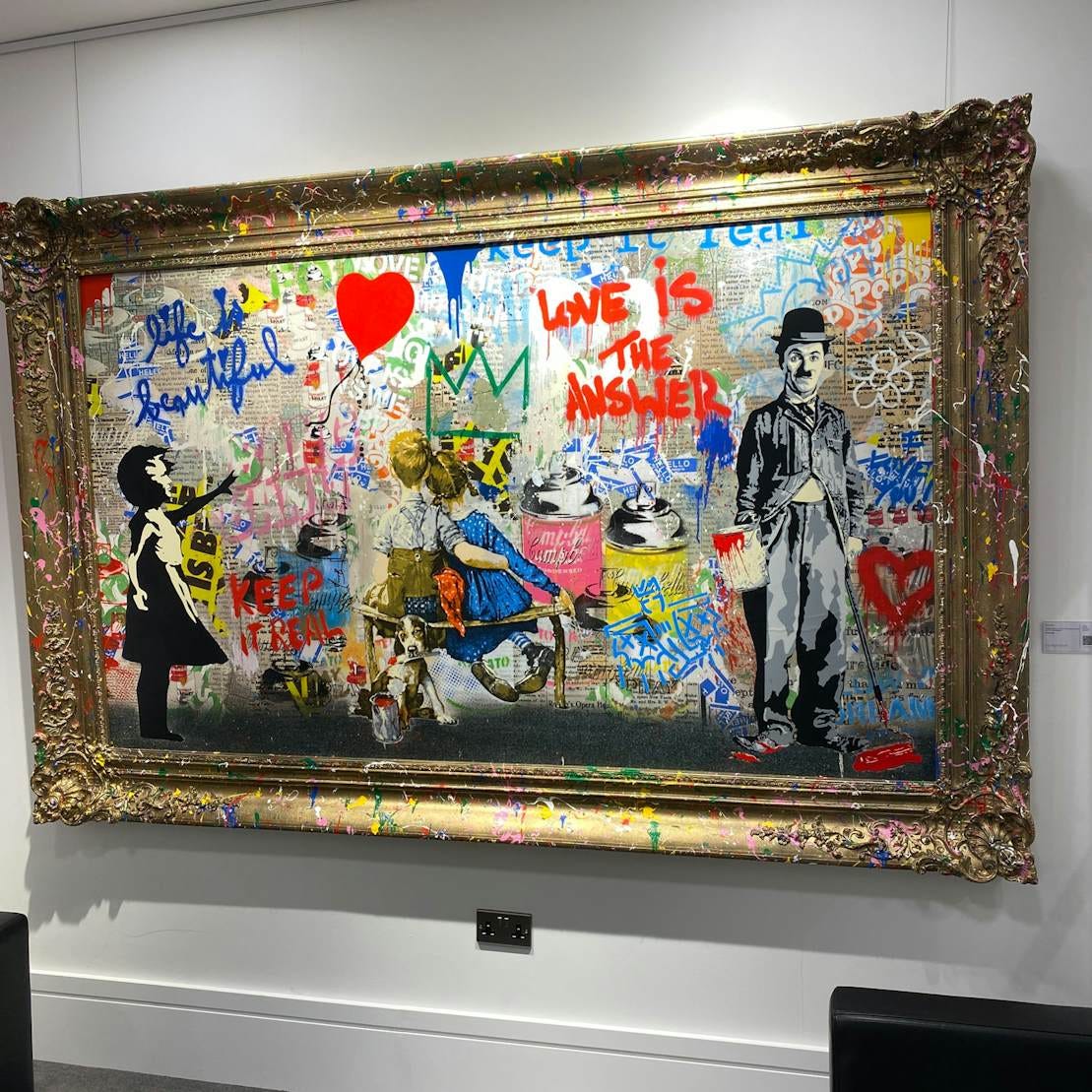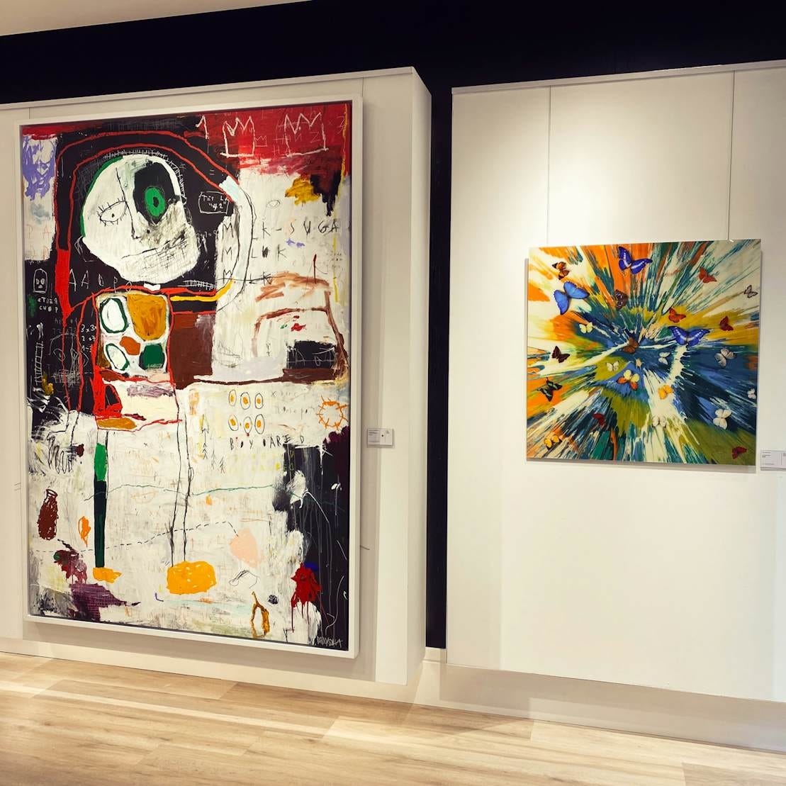 Nearby was a spin/butterfly picture by Damien Hirst, for £8,950. On the back wall was a riot of street art and graffiti by an artist calling himself “Mr Brainwash”, a former collaborator of street artist Banksy (asking price £145,000).
