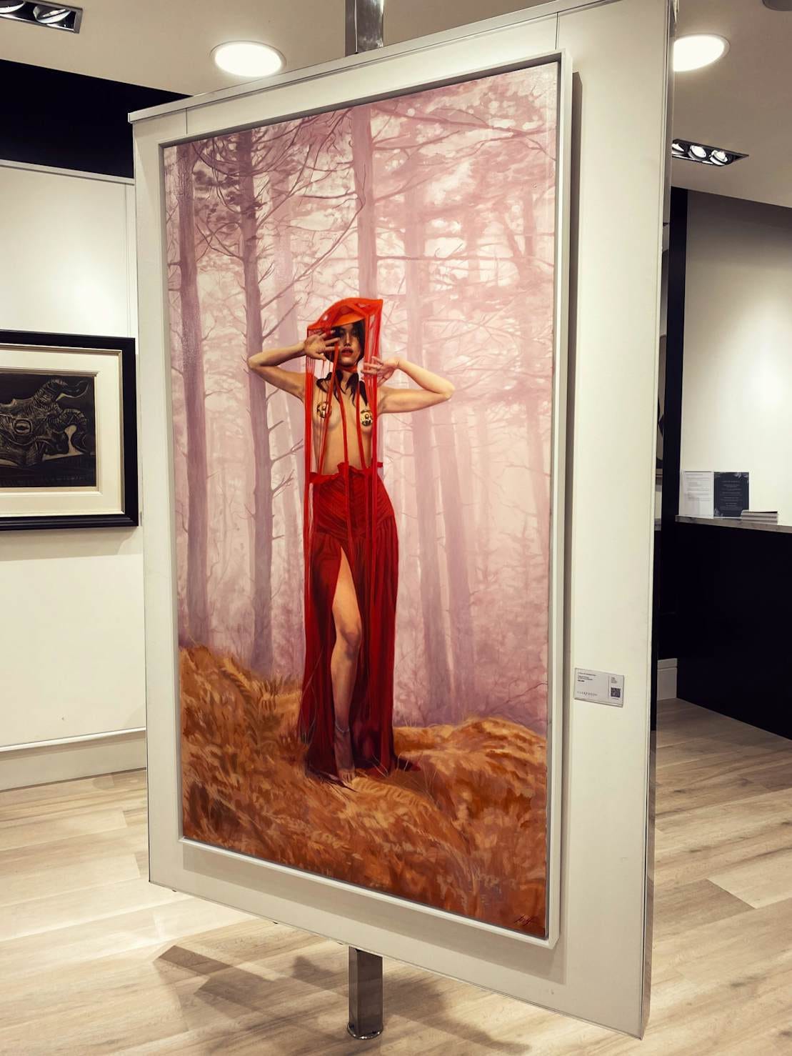 In a prominent spot in the centre of the gallery was a painting of a woman standing in a pine forest in a red dress — the upper part of which seemed to have been shredded, her nipples covered by brass plaques (by Mila Alexander: asking price £22,000).